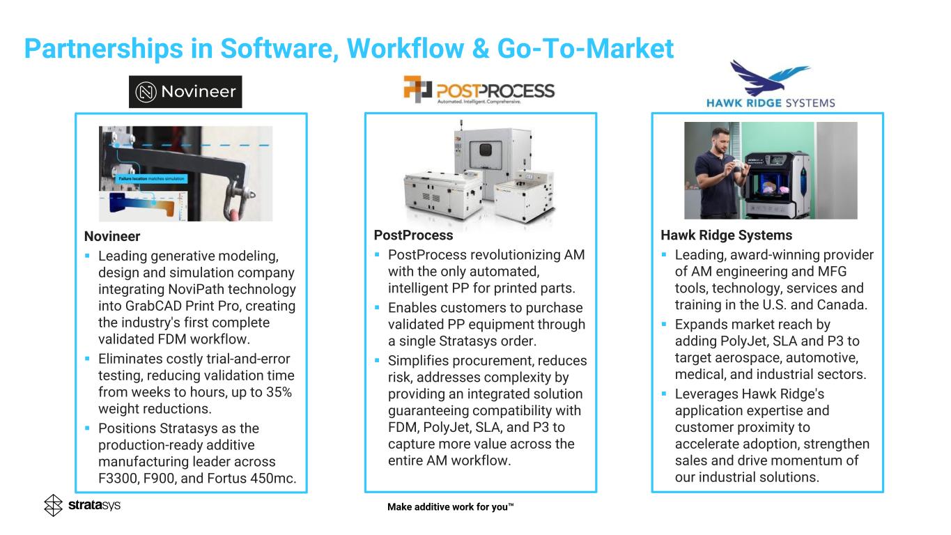 Make additive work for you Novineer ▪ Leading generative modeling, design and simulation company integrating NoviPath technology into GrabCAD Print Pro, creating the industry's first complete validated FDM workflow. ▪ Eliminates costly trial-and-error testing, reducing validation time from weeks to hours, up to 35% weight reductions. ▪ Positions Stratasys as the production-ready additive manufacturing leader across F3300, F900, and Fortus 450mc. Partnerships in Software, Workflow & Go-To-Market PostProcess ▪ PostProcess revolutionizing AM with the only automated, intelligent PP for printed parts. ▪ Enables customers to purchase validated PP equipment through a single Stratasys order. ▪ Simplifies procurement, reduces risk, addresses complexity by providing an integrated solution guaranteeing compatibility with FDM, PolyJet, SLA, and P3 to capture more value across the entire AM workflow. Hawk Ridge Systems ▪ Leading, award-winning provider of AM engineering and MFG tools, technology, services and training in the U.S. and Canada. ▪ Expands market reach by adding PolyJet, SLA and P3 to target aerospace, automotive, medical, and industrial sectors. ▪ Leverages Hawk Ridge's application expertise and customer proximity to accelerate adoption, strengthen sales and drive momentum of our industrial solutions.