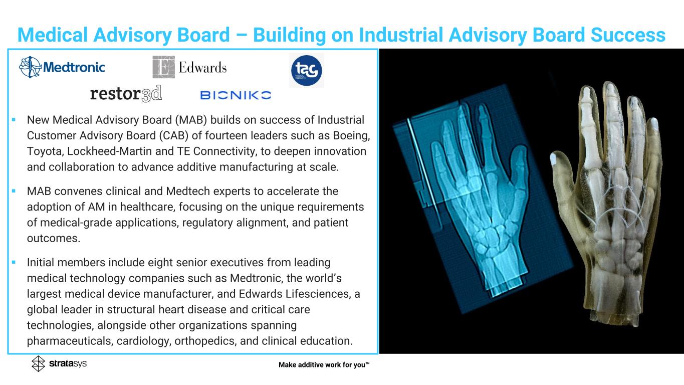 Medical Advisory Board – Building on Industrial Advisory Board Success Make additive work for you ▪ New Medical Advisory Board (MAB) builds on success of Industrial Customer Advisory Board (CAB) of fourteen leaders such as Boeing, Toyota, Lockheed-Martin and TE Connectivity, to deepen innovation and collaboration to advance additive manufacturing at scale. ▪ MAB convenes clinical and Medtech experts to accelerate the adoption of AM in healthcare, focusing on the unique requirements of medical-grade applications, regulatory alignment, and patient outcomes. ▪ Initial members include eight senior executives from leading medical technology companies such as Medtronic, the world’s largest medical device manufacturer, and Edwards Lifesciences, a global leader in structural heart disease and critical care technologies, alongside other organizations spanning pharmaceuticals, cardiology, orthopedics, and clinical education.