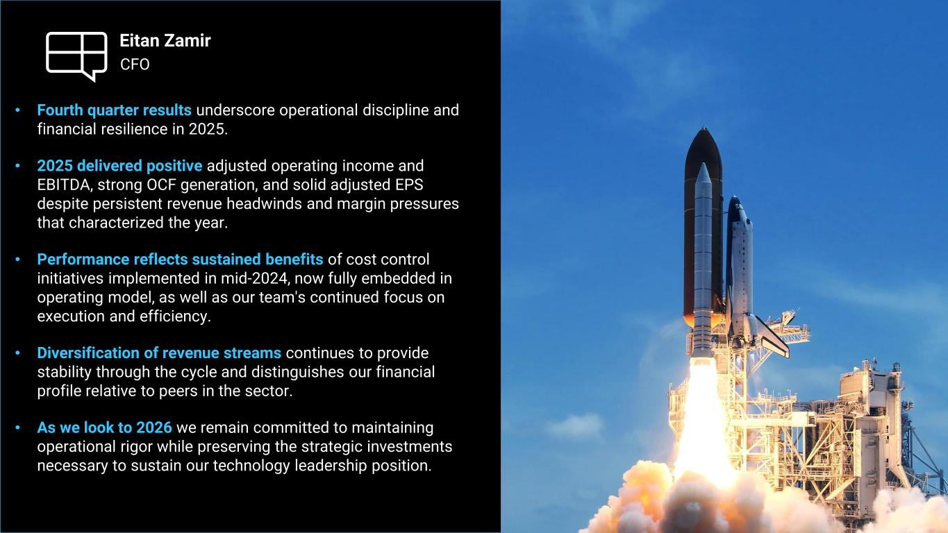 CFO Eitan Zamir • Fourth quarter results underscore operational discipline and financial resilience in 2025. • 2025 delivered positive adjusted operating income and EBITDA, strong OCF generation, and solid adjusted EPS despite persistent revenue headwinds and margin pressures that characterized the year. • Performance reflects sustained benefits of cost control initiatives implemented in mid-2024, now fully embedded in operating model, as well as our team's continued focus on execution and efficiency. • Diversification of revenue streams continues to provide stability through the cycle and distinguishes our financial profile relative to peers in the sector. • As we look to 2026 we remain committed to maintaining operational rigor while preserving the strategic investments necessary to sustain our technology leadership position.