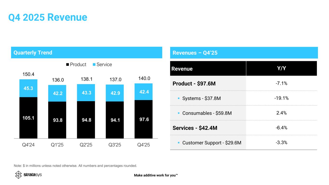 Quarterly Trend 105.1 93.8 94.8 94.1 97.6 45.3 42.2 43.3 42.9 42.4 150.4 136.0 138.1 137.0 140.0 Q4'24 Q1'25 Q2'25 Q3'25 Q4'25 Product Service Q4 2025 Revenue Note: $ in millions unless noted otherwise. All numbers and percentages rounded. Make additive work for you Revenues – Q4’25 Revenue Y/Y Product - $97.6M -7.1% ▪ Systems - $37.8M -19.1% ▪ Consumables - $59.8M 2.4% Services - $42.4M -6.4% ▪ Customer Support - $29.6M -3.3%