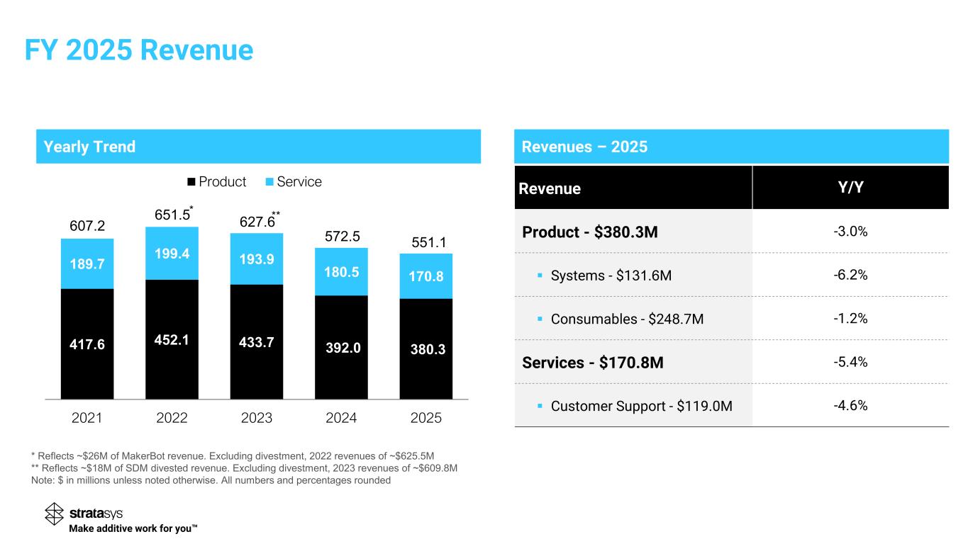 Revenues – 2025 Revenue Y/Y Product - $380.3M -3.0% ▪ Systems - $131.6M -6.2% ▪ Consumables - $248.7M -1.2% Services - $170.8M -5.4% ▪ Customer Support - $119.0M -4.6% FY 2025 Revenue Make additive work for you Yearly Trend 417.6 452.1 433.7 392.0 380.3 189.7 199.4 193.9 180.5 170.8 2021 2022 2023 2024 2025 Product Service * ** * Reflects ~$26M of MakerBot revenue. Excluding divestment, 2022 revenues of ~$625.5M ** Reflects ~$18M of SDM divested revenue. Excluding divestment, 2023 revenues of ~$609.8M Note: $ in millions unless noted otherwise. All numbers and percentages rounded 551.1572.5 627.6 651.5 607.2