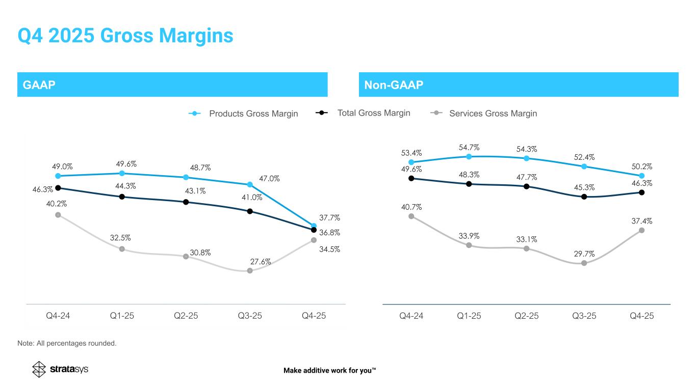 GAAP Non-GAAP 49.6% 48.3% 47.7% 45.3% 46.3% 53.4% 54.7% 54.3% 52.4% 50.2% 40.7% 33.9% 33.1% 29.7% 37.4% Q4-24 Q1-25 Q2-25 Q3-25 Q4-25 Services Gross MarginProducts Gross Margin Total Gross Margin Make additive work for you Note: All percentages rounded. Q4 2025 Gross Margins 49.0% 49.6% 48.7% 47.0% 37.7% 40.2% 32.5% 30.8% 27.6% 34.5% 46.3% 44.3% 43.1% 41.0% 36.8% Q4-24 Q1-25 Q2-25 Q3-25 Q4-25