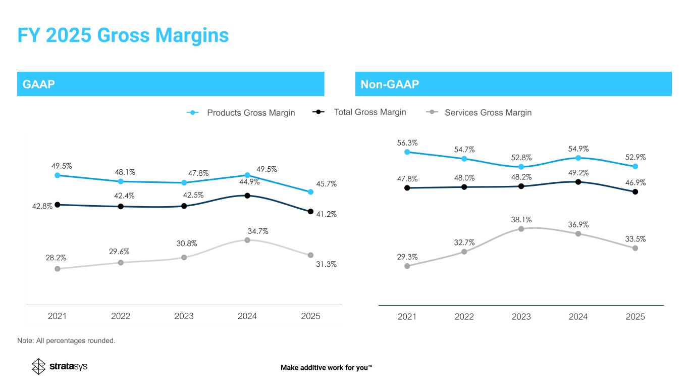 GAAP Non-GAAP 47.8% 48.0% 48.2% 49.2% 46.9% 56.3% 54.7% 52.8% 54.9% 52.9% 29.3% 32.7% 38.1% 36.9% 33.5% 2021 2022 2023 2024 2025 Services Gross MarginProducts Gross Margin Total Gross Margin Make additive work for you Note: All percentages rounded. FY 2025 Gross Margins 49.5% 48.1% 47.8% 49.5% 45.7% 28.2% 29.6% 30.8% 34.7% 31.3% 42.8% 42.4% 42.5% 44.9% 41.2% 2021 2022 2023 2024 2025