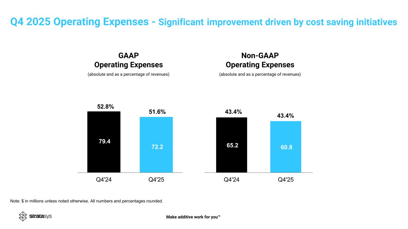 GAAP Operating Expenses (absolute and as a percentage of revenues) Non-GAAP Operating Expenses (absolute and as a percentage of revenues) 79.4 72.2 51.6% Q4'24 Q4'25 52.8% 65.2 60.8 Q4'24 Q4'25 43.4% 43.4% Note: $ in millions unless noted otherwise. All numbers and percentages rounded. Make additive work for you Q4 2025 Operating Expenses - Significant improvement driven by cost saving initiatives