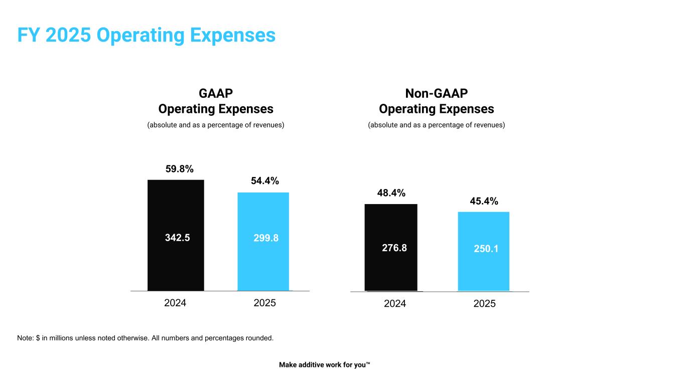 GAAP Operating Expenses (absolute and as a percentage of revenues) Non-GAAP Operating Expenses (absolute and as a percentage of revenues) 2024 2025 342.5 59.8% 54.4% Note: $ in millions unless noted otherwise. All numbers and percentages rounded. FY 2025 Operating Expenses Make additive work for you 299.8 2024 2025 276.8 250.1 45.4% 48.4% 276.8 250.1 342.5 299.8