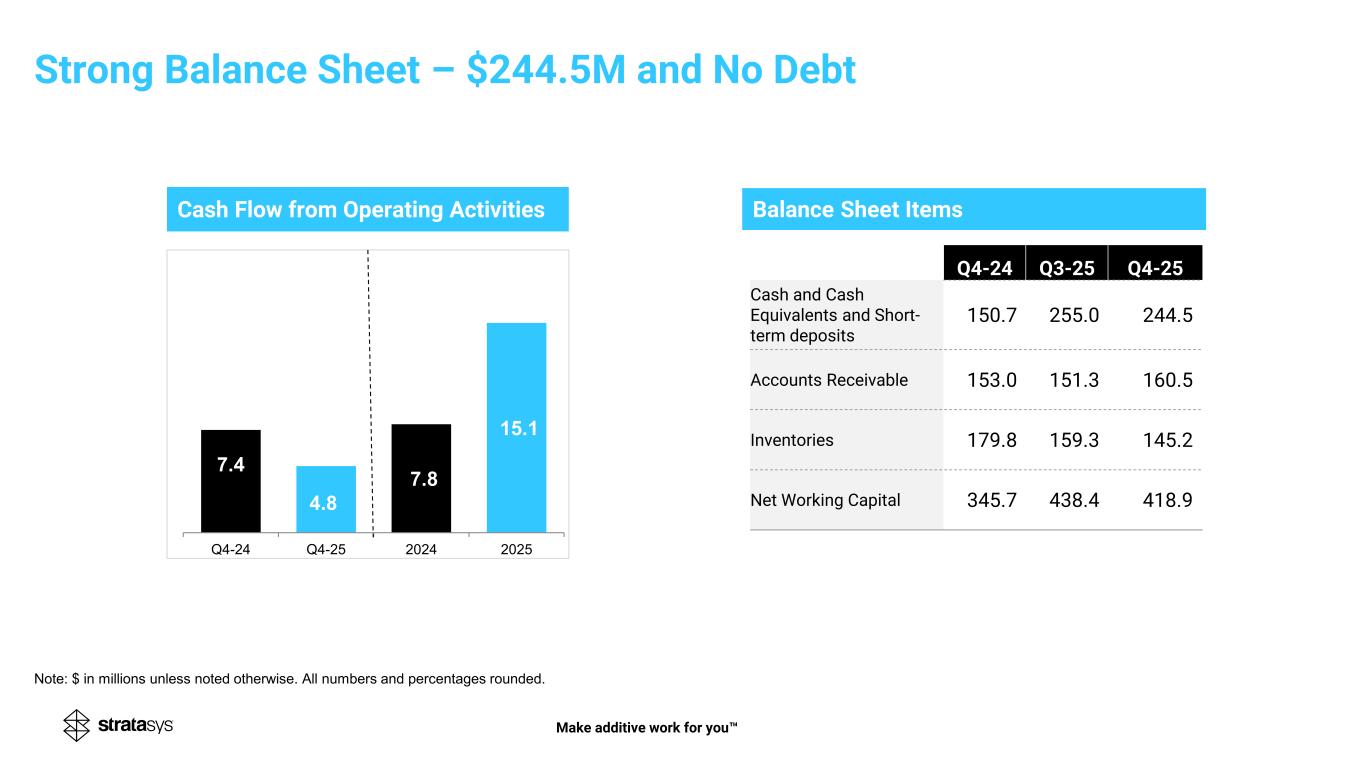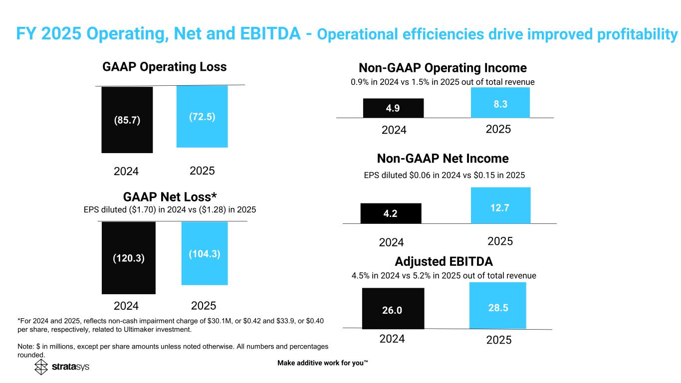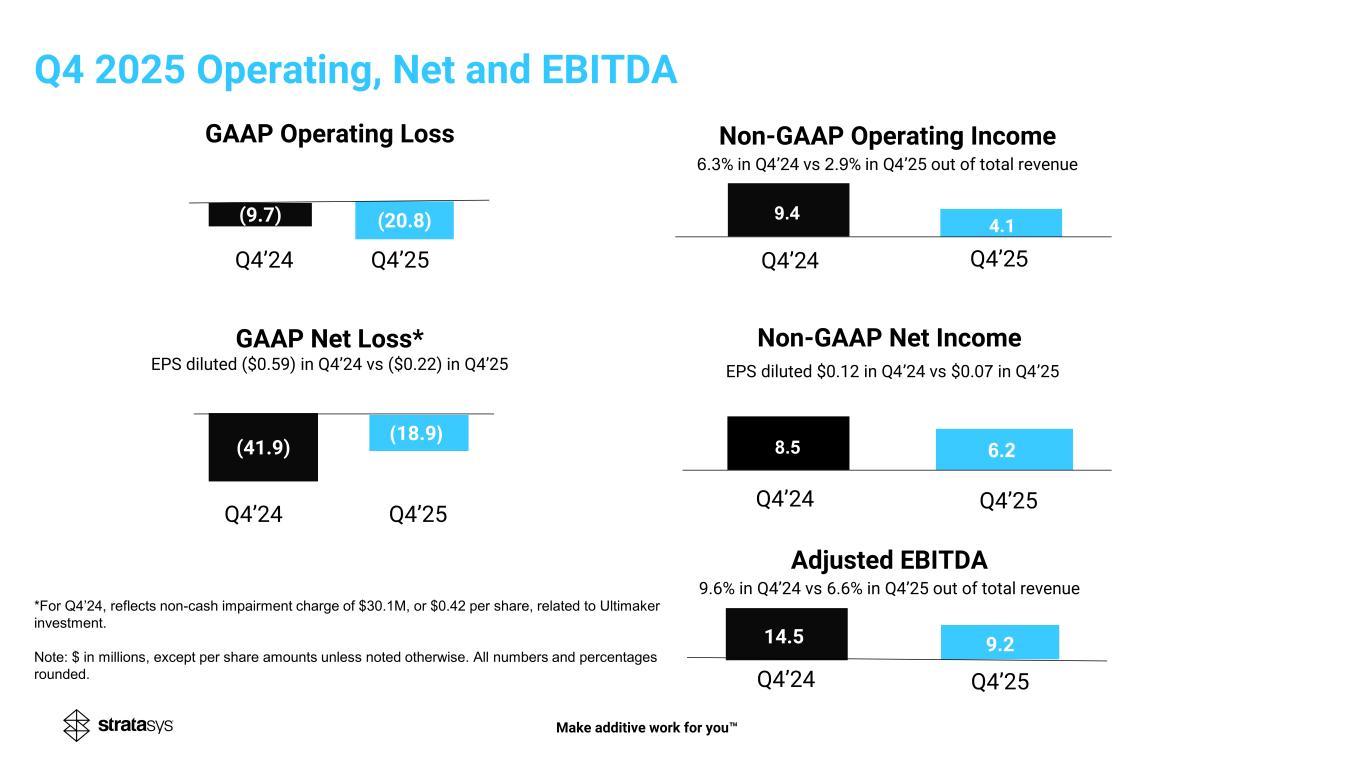 (41.9) )18.9( (20.8) Non-GAAP Operating Income 6.3% in Q4’24 vs 2.9% in Q4’25 out of total revenue GAAP Operating Loss Non-GAAP Net Income EPS diluted $0.12 in Q4’24 vs $0.07 in Q4’25 GAAP Net Loss* EPS diluted ($0.59) in Q4’24 vs ($0.22) in Q4’25 Q4’24 Q4’25 9.214.5 6.2 Adjusted EBITDA 9.6% in Q4’24 vs 6.6% in Q4’25 out of total revenue 9.4 4.1 8.5 Q4’24 Q4’25 Q4’24 Q4’25 Q4’24 Q4’25 Q4’24 Q4’25 (9.7) Q4 2025 Operating, Net and EBITDA *For Q4’24, reflects non-cash impairment charge of $30.1M, or $0.42 per share, related to Ultimaker investment. Note: $ in millions, except per share amounts unless noted otherwise. All numbers and percentages rounded. Make additive work for you