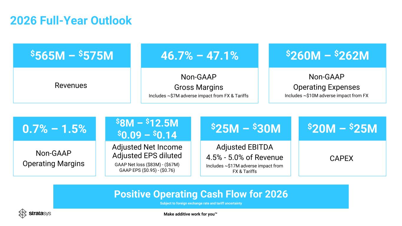 Revenues Non-GAAP Operating Expenses Includes ~$10M adverse impact from FX Non-GAAP Operating Margins Adjusted Net Income Adjusted EPS diluted GAAP Net loss ($83M) - ($67M) GAAP EPS ($0.95) - ($0.76) CAPEX Adjusted EBITDA 4.5% - 5.0% of Revenue Includes ~$17M adverse impact from FX & Tariffs $565M – $575M 46.7% – 47.1% $260M – $262M $20M – $25M$25M – $30M0.7% – 1.5% Positive Operating Cash Flow for 2026 Subject to foreign exchange rate and tariff uncertainty 2026 Full-Year Outlook $8M – $12.5M $0.09 – $0.14 Make additive work for you Non-GAAP Gross Margins Includes ~$7M adverse impact from FX & Tariffs