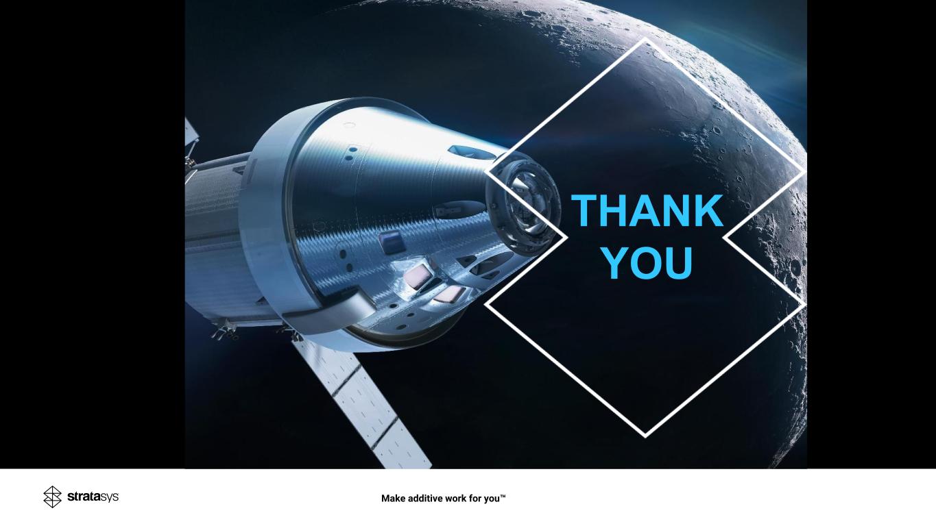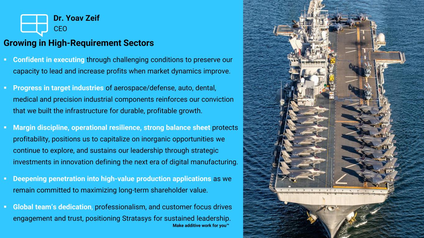 CEO Dr. Yoav Zeif Growing in High-Requirement Sectors ▪ Confident in executing through challenging conditions to preserve our capacity to lead and increase profits when market dynamics improve. ▪ Progress in target industries of aerospace/defense, auto, dental, medical and precision industrial components reinforces our conviction that we built the infrastructure for durable, profitable growth. ▪ Margin discipline, operational resilience, strong balance sheet protects profitability, positions us to capitalize on inorganic opportunities we continue to explore, and sustains our leadership through strategic investments in innovation defining the next era of digital manufacturing. ▪ Deepening penetration into high-value production applications as we remain committed to maximizing long-term shareholder value. ▪ Global team’s dedication, professionalism, and customer focus drives engagement and trust, positioning Stratasys for sustained leadership. Make additive work for you