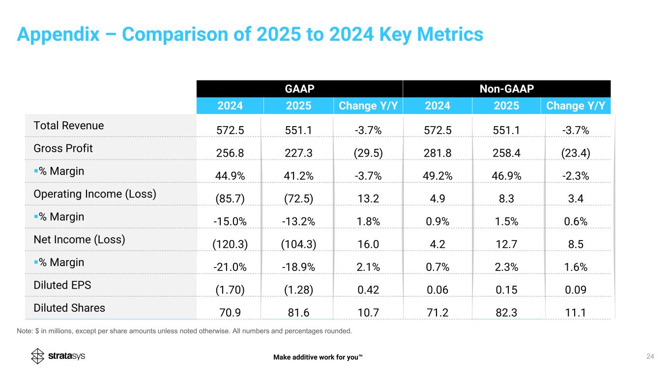 23 Note: $ in millions, except per share amounts unless noted otherwise. All numbers and percentages rounded. 23 Appendix – Comparison of Q4 2025 to Q4 2024 Key Metrics Make additive work for you GAAP Non-GAAP Q4-24 Q4-25 Change Y/Y Q4-24 Q4-25 Change Y/Y Total Revenue 150.4 140.0 -6.9% 150.4 140.0 -6.9% Gross Profit 69.7 51.5 (18.2) 74.6 64.9 (9.7) ▪% Margin 46.3% 36.8% -9.5% 49.6% 46.3% -3.3% Operating Income (Loss) (9.7) (20.8) (11.1) 9.4 4.1 (5.3) ▪% Margin -6.4% -14.9% -8.5% 6.3% 2.9% -3.4% Net Income (Loss) (41.9) (18.9) 23.0 8.5 6.2 (2.3) ▪% Margin -27.9% -13.5% 14.4% 5.7% 4.4% -1.3% Diluted EPS (0.59) (0.22) 0.37 0.12 0.07 (0.05) Diluted Shares 71.4 85.7 14.3 71.7 86.3 14.6