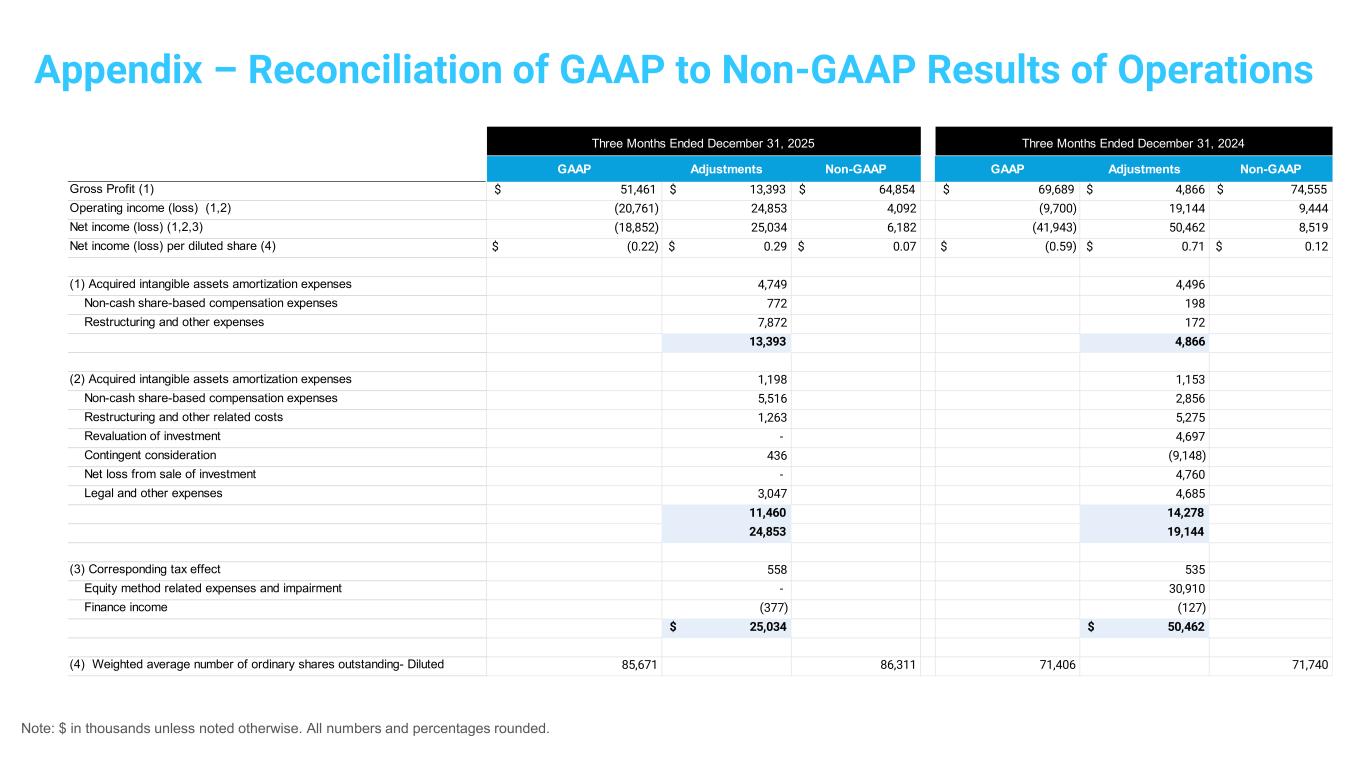 Note: $ in thousands unless noted otherwise. All numbers and percentages rounded. Appendix – Reconciliation of GAAP to Non-GAAP Results of Operations GAAP Adjustments Non-GAAP GAAP Adjustments Non-GAAP Gross Profit (1) $ 51,461 $ 13,393 $ 64,854 $ 69,689 $ 4,866 $ 74,555 Operating income (loss) (1,2) (20,761) 24,853 4,092 (9,700) 19,144 9,444 Net income (loss) (1,2,3) (18,852) 25,034 6,182 (41,943) 50,462 8,519 Net income (loss) per diluted share (4) $ (0.22) $ 0.29 $ 0.07 $ (0.59) $ 0.71 $ 0.12 (1) Acquired intangible assets amortization expenses 4,749 4,496 Non-cash share-based compensation expenses 772 198 Restructuring and other expenses 7,872 172 13,393 4,866 (2) Acquired intangible assets amortization expenses 1,198 1,153 Non-cash share-based compensation expenses 5,516 2,856 Restructuring and other related costs 1,263 5,275 Revaluation of investment - 4,697 Contingent consideration 436 (9,148) Net loss from sale of investment - 4,760 Legal and other expenses 3,047 4,685 11,460 14,278 24,853 19,144 (3) Corresponding tax effect 558 535 Equity method related expenses and impairment - 30,910 Finance income (377) (127) $ 25,034 $ 50,462 (4) Weighted average number of ordinary shares outstanding- Diluted 85,671 86,311 71,406 71,740 Three Months Ended December 31, 2025 Three Months Ended December 31, 2024