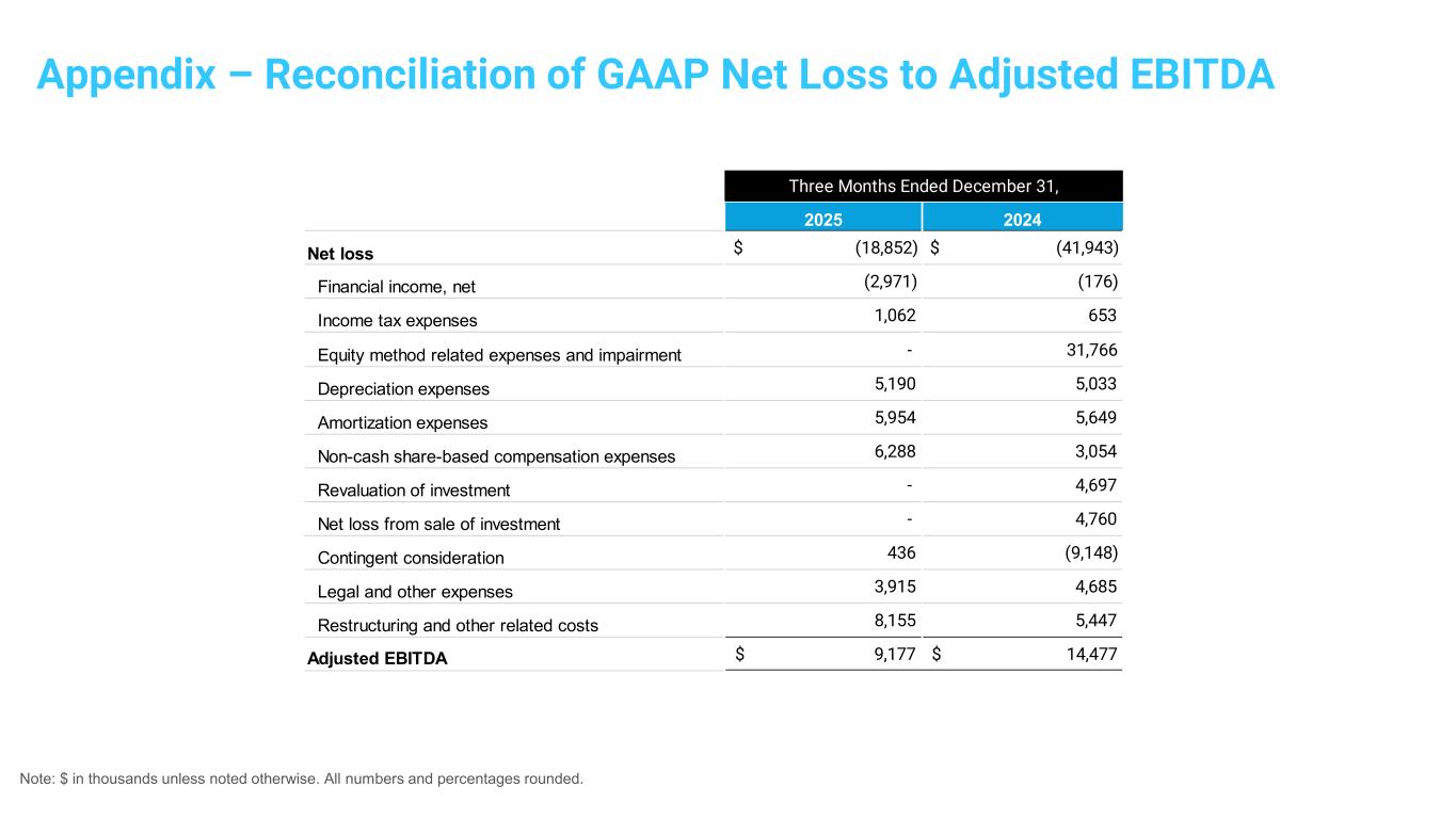 Note: $ in thousands unless noted otherwise. All numbers and percentages rounded. Appendix – Reconciliation of GAAP Net Loss to Adjusted EBITDA 2025 2024 Net loss $ (18,852) $ (41,943) Financial income, net (2,971) (176) Income tax expenses 1,062 653 Equity method related expenses and impairment - 31,766 Depreciation expenses 5,190 5,033 Amortization expenses 5,954 5,649 Non-cash share-based compensation expenses 6,288 3,054 Revaluation of investment - 4,697 Net loss from sale of investment - 4,760 Contingent consideration 436 (9,148) Legal and other expenses 3,915 4,685 Restructuring and other related costs 8,155 5,447 Adjusted EBITDA $ 9,177 $ 14,477 Three Months Ended December 31,